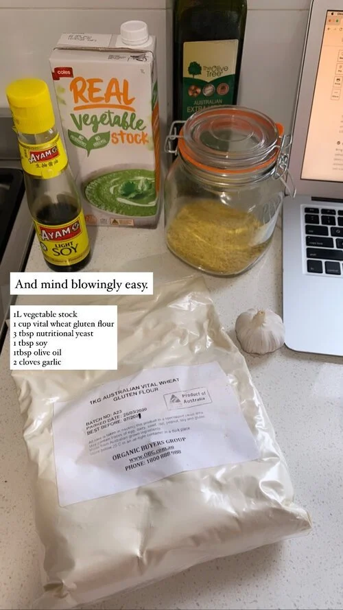 I feel like more people need to know about this. Wheat gluten is made by washing wheat flour dough until all the starch granules have been removed, leaving the sticky insoluble gluten as an elastic mass. You can purchase this dry as “wheat gluten flour” which which you can make seitan from (a popular meat substitute). It’s super easy to make, requires only super cheap ingredients and it’s look and taste is surprisingly meaty. You can eat it with like anything but I personally love it on a sandwich. 21g protein + 120 calories per 30g serve.